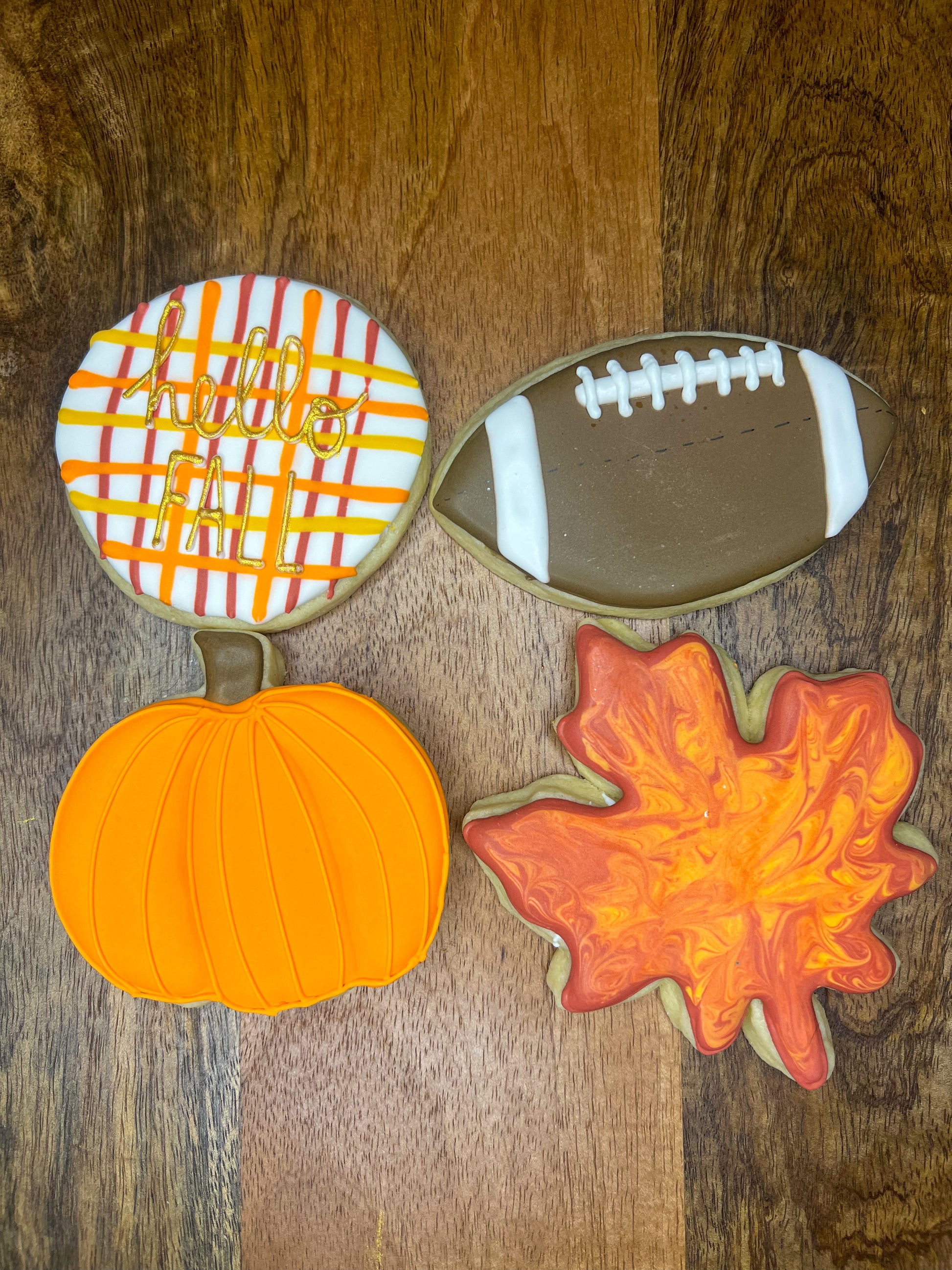 Buttery vanilla sugar cookies topped with hand-piped royal icing in game-day colors. Each set features: